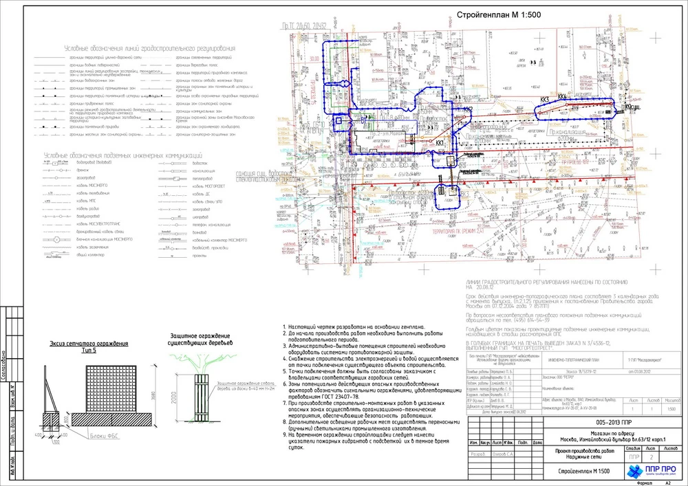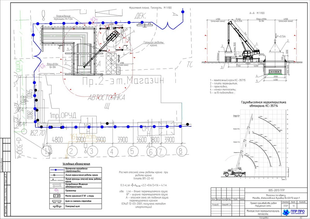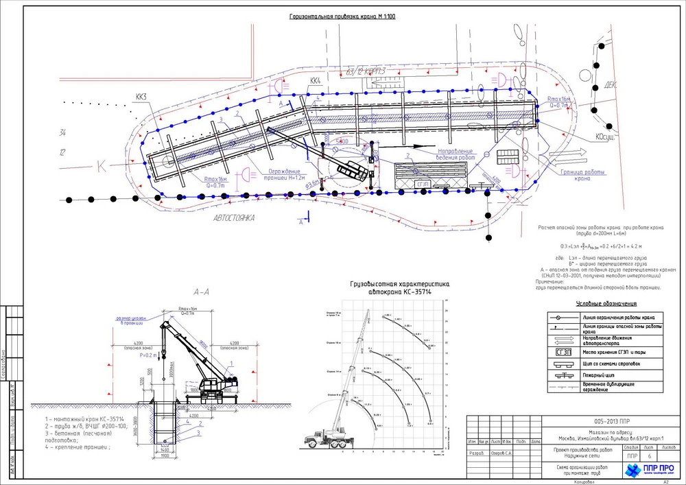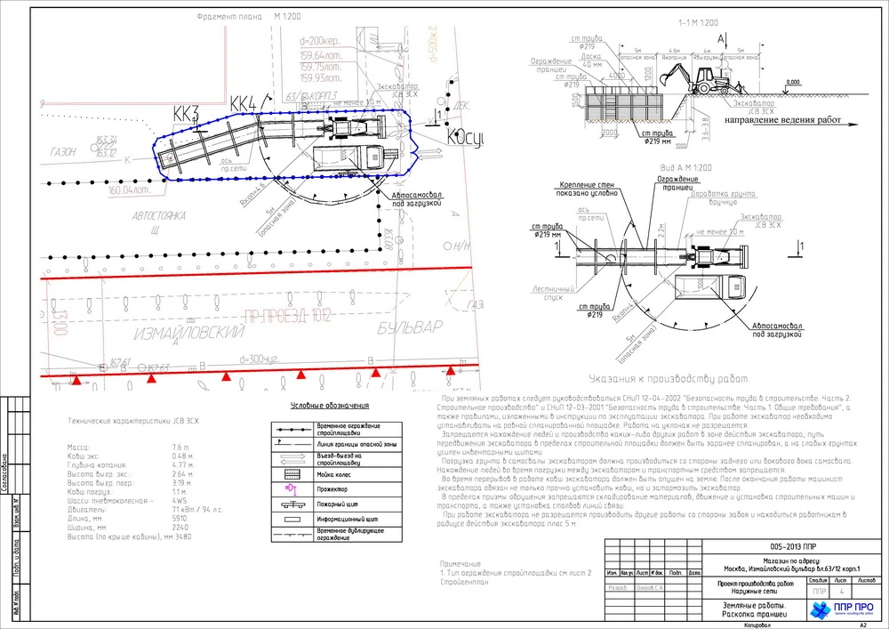 - Опасные зоны, зоны действия строительных машин и участки пересечения с теплосетями, теплотрассами и кабелем 10 кВ обозначаются на схемах и ограждаются до начала земляных операций;